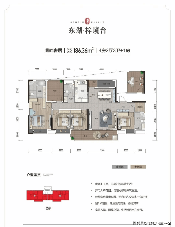 奢阔的186.36平方米户型为5房2厅3卫,双卧套房设计可满足多代同堂需求,超8米宽景阳台尽享安逸品质生活。