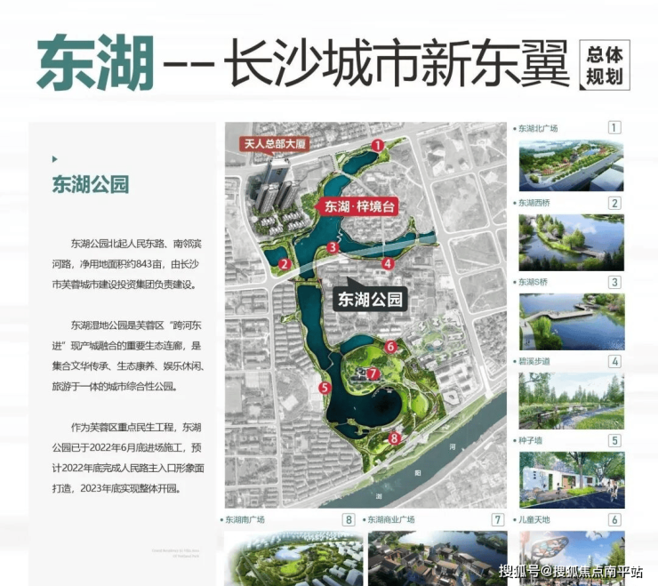 东湖公园:净用地面积约843亩,是芙蓉区“跨河东进”实现产城融合的重要生态连廊,未来比肩洋湖湿地公园,2023年底实现整体开园。