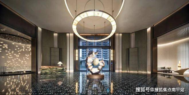 穿过黄铜大门,来到接待中心前厅,这里的空间感十足。主色调采用定制的 “珺绿色”,地面铺装天珺专属的星空猫眼绿拼花奢石,中央的玉石艺术品 “破璞成玉” 更是震撼人心。整个示范区以 “玉” 为创作底蕴,总面积近万方,造价过亿,打造了六幕十二境的礼序感受,诚意满满。