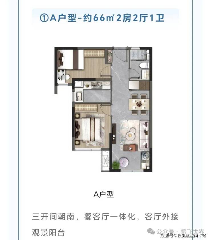 (2)空间革新:77㎡三房采用五开间朝南设计,得房率高达88%,对标岛内100㎡功能;