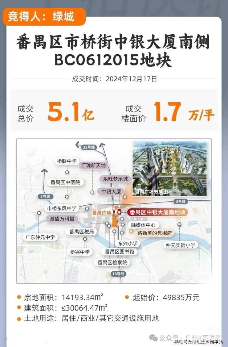 绿城(广州西溪投资发展有限公司)以5.08亿元拿下番禺区市桥街中银大厦南侧BC0612015地块。