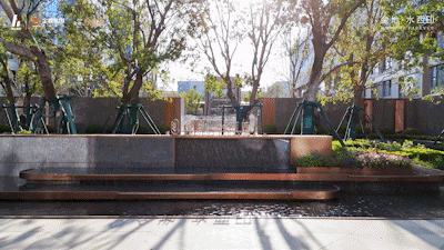 一轴・三园・五进归家动线,层层递进, 串联4大特色主题水景,入口跳泉叠水灵动欢快、流水艺术中庭诗意盎然、镜面水景倒映天光云影、下沉流水叠瀑气势磅礴,四季流转的景致在此编织成诗。