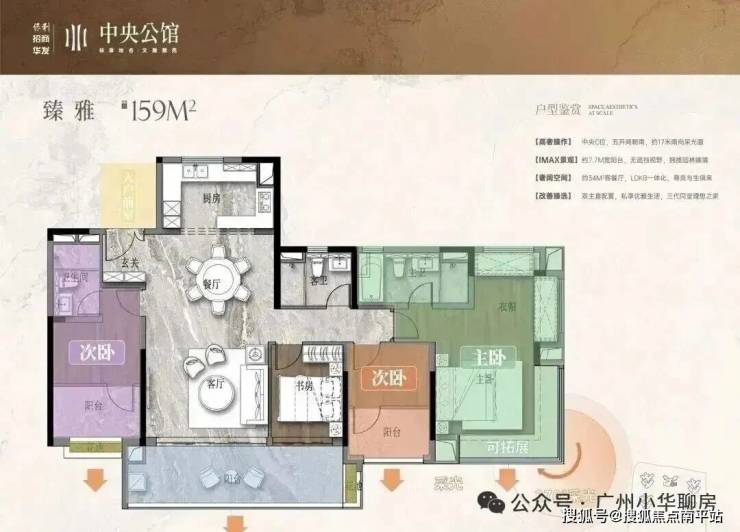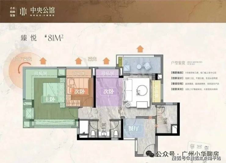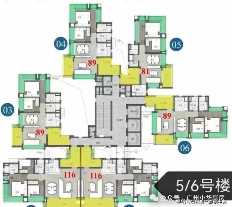 保利招商华发中央公馆采用了围合式设计,6栋47层高塔楼设计,小区自身配建有文化体育场馆和幼儿园,除了2#楼王是两梯四户,其余均为三梯六户,8#是5层高的文化馆,9#是配建3层高的幼儿园。
