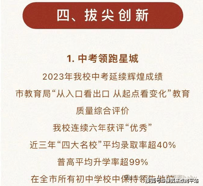 •平均升学率第一:近三年"四大名校"平均录取率超40%!(2023全市平均“四大”录取率不足8%),普高平均升学率超99%!(2023年全市公办普高平均录取率约48%),在全市所有初中学校中保持领先地位;(备注:数据来源于网络)