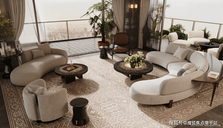 ●270°环幕视野:全景舱联动约20米露台,270°采光将晋阳湖一线湖景、万国花园与城市天际尽收眼底,阳光清风自由流淌,室内外交互互融,实现别墅级分区与平层便利性的完美结合;