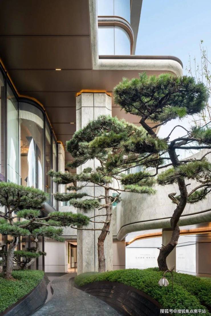北向庭院结合了拟态的山境斜坡和生生不息的龙鳞流水,南向则是水景旁的百年油松林。