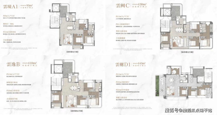 项目由7栋15-17层的小高层组成,共计340套,产品涵盖93-130㎡三至四房及约143㎡四代宅,均为2梯2户设计,户户享独立入户门厅,3米层高搭配98%-113%的高户型使用率,居住尺度舒适。部分户型还配备外阳台、270°弧形落地窗等。