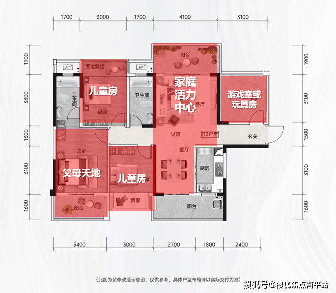 客餐厅+阳台一体化是家庭的「活力中心」,父母陪伴孩子启蒙阅读的场所。主卧父母天地,双次卧儿童房,多功能房是游戏室或玩具房。