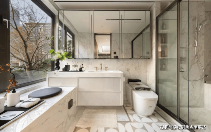 主卫的镜柜,也做双面收纳设计。主卫延伸出来的创新飘窗,可以在上面摆放各种日常用品。