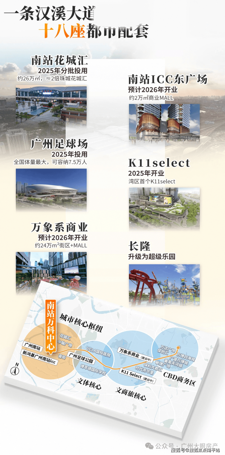 南站ICC、花城汇、喜街、K11select、万象系,密如蛛网的地标商业,带来世界级地标商圈配置,出门就是逛不完的高端商业。 从南站到足球场,再到长隆万博,一站式的枢纽、文体文旅、商圈等资源紧密咬合,自由流动。
