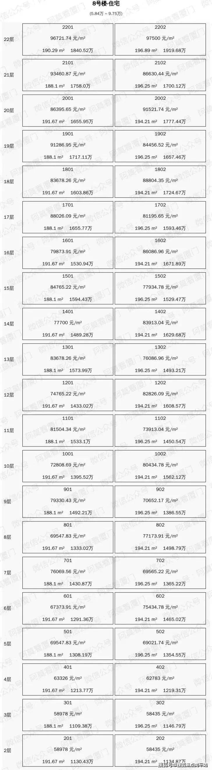 8号楼户型面积约188-197㎡,预售价格为58435-97500元/㎡,总价约1109-1920万元。