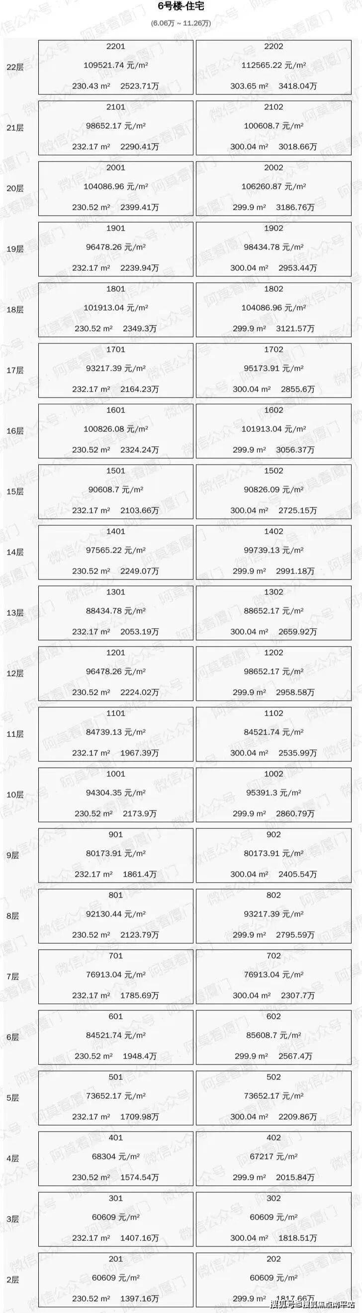 第二批房源预售证获批:6、7、8# 楼,总共126套住宅!6号楼户型面积约230㎡-303㎡,预售价格为60609-112565元/㎡,总价约1397-3418万元。