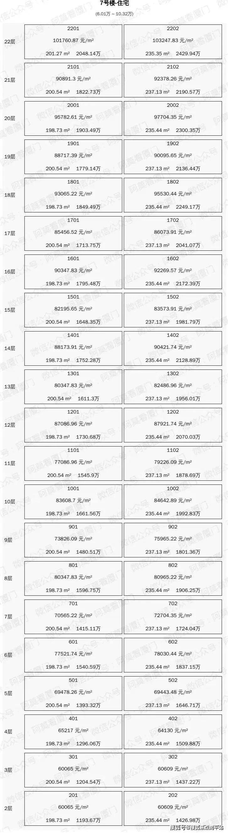 7号楼户型面积约199-237㎡,预售价格为60065-103247元/㎡,总价约1194-2430万元。