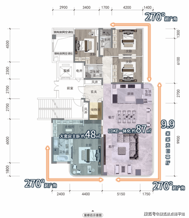 这个户型最大的特点就在于其为业主提供了一个全新视界,客厅、主卧、次卧三个功能空间都实现了270°的超大广角无界视野,通风采光,并且各自看到都是一个完全不同的视角。