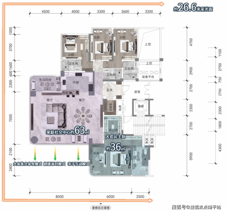 活动空间越大,家庭模式越多元化。该户型拥有63㎡的家庭社交中心,面积尺度足足相当于别人的一套房,给了家庭互动最大的生活自由,它既可以是大家族合家欢模式,也可以是超级派对模式、亲子互动模式。