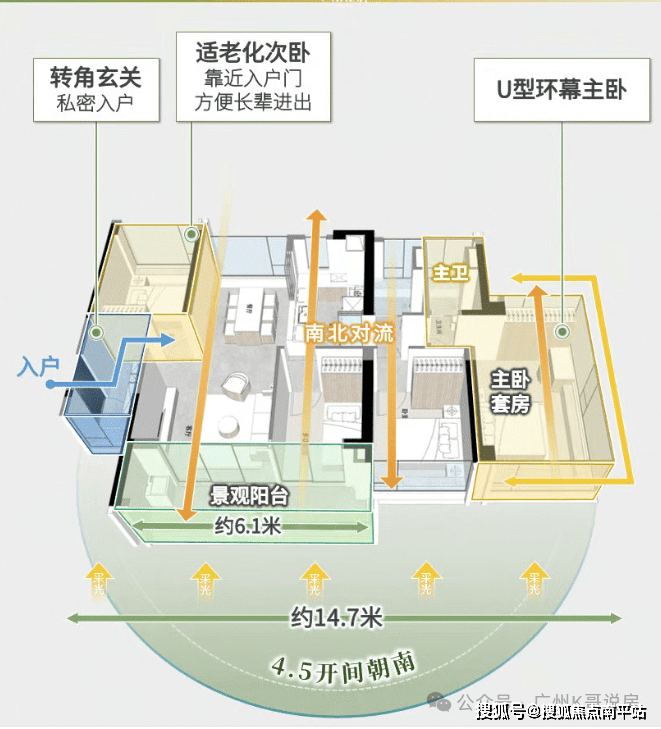 南向约14.7米、4.5个开间的布局,三面环幕,通透敞亮。