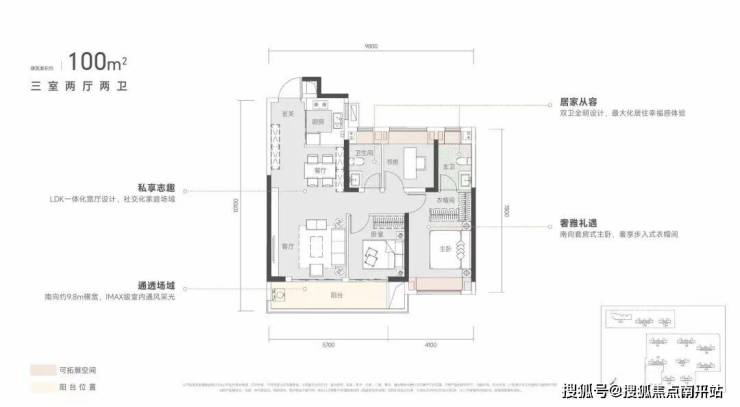 建面约100㎡三房两厅两卫: