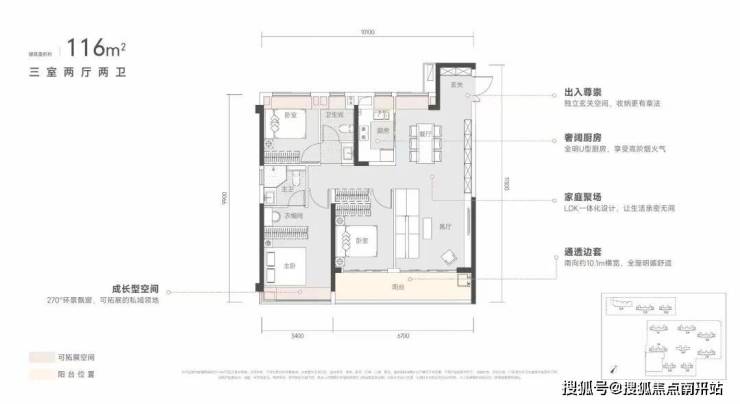建面约116平米三房两厅两卫: