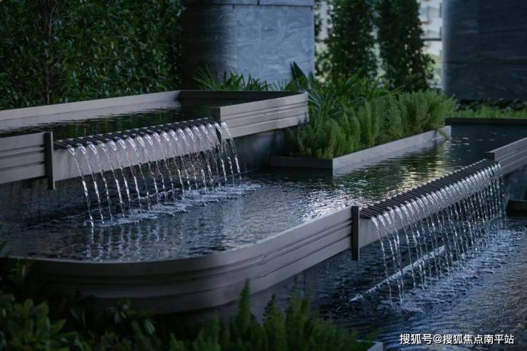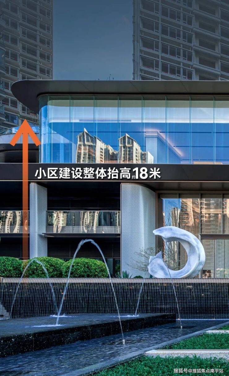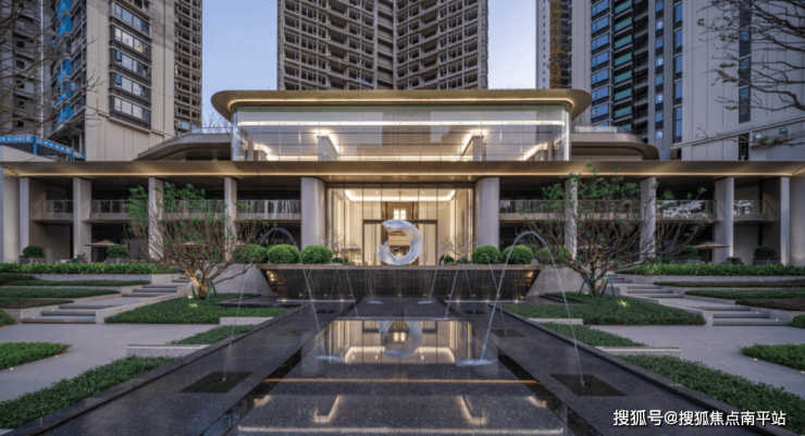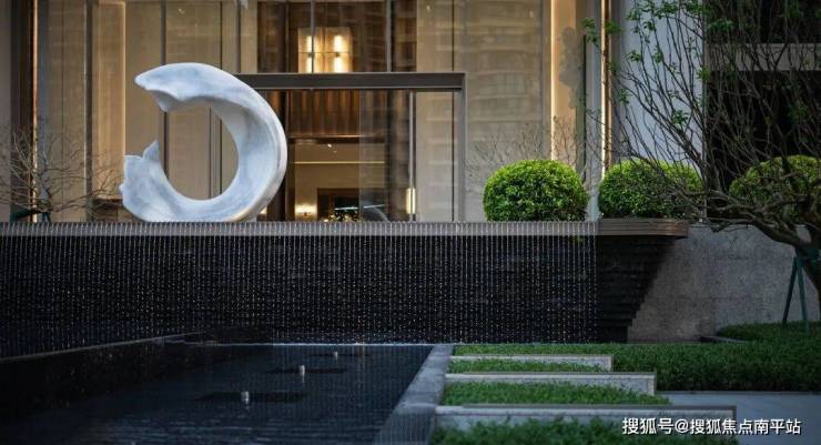 总长近80米、高度约18米的游轮级大门,以8根立柱9个门头空间及5级水景阶梯为主,为归家业主营造尊贵感。取意“高山流水”的五级叠水景观,以“蓝钻”石材打造,工艺媲美顶豪。文化与匠心的双重落地,将迎宾仪式感,转化为实实在在的归家尊崇体验。