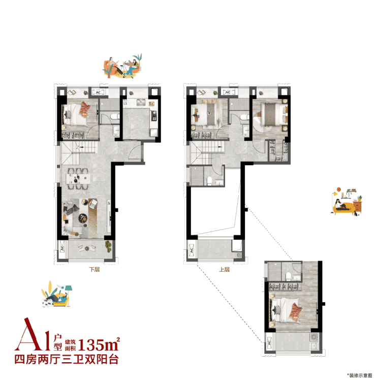 以心邸建面约135㎡户型为例:四房两厅三卫的格局,实现“动静分离”与“隔代分离”的双重平衡。