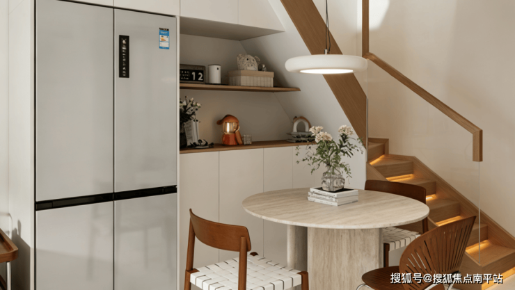 功能的复合叙事:将冰箱与餐边功能嵌入楼梯下方,这不仅是一次对厨房空间的解放,更是赋予餐厅强大的收纳机能;不占视界,延续空间的呼吸感。