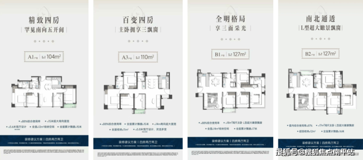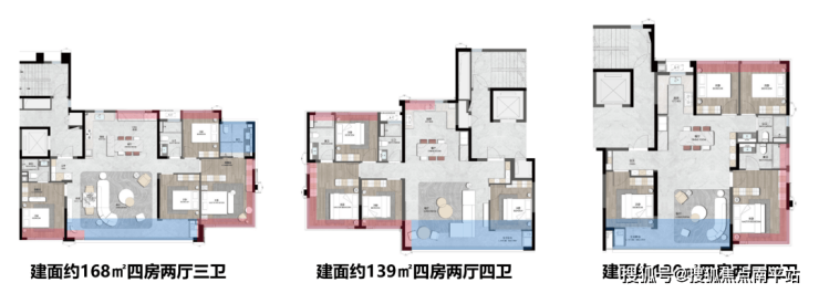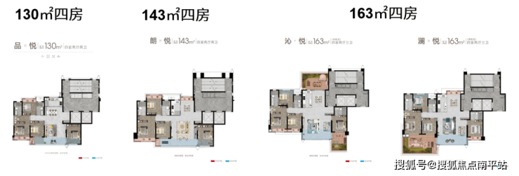 该楼盘主打高端改善型住宅,全系采用“2梯2户+电梯厅独享”设计,私密性突出。户型均为四房,面积从127㎡到169㎡,形成清晰的产品阶梯。