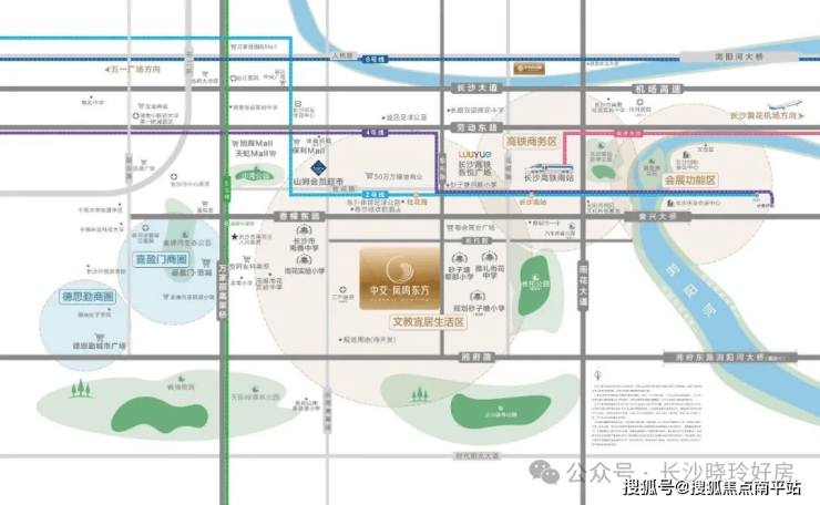 高铁南站/机场/京港澳高速/磁悬浮/城市道路(劳动路、花侯路、雨花高架、湘府高架)/地铁(2号线杜花路站、2/4号线长沙南站)