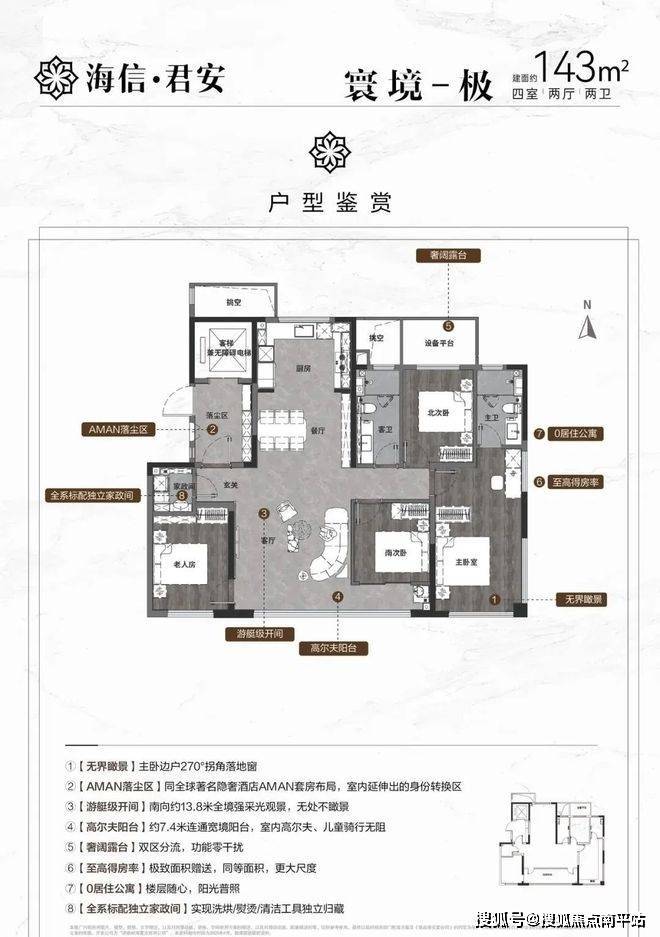143平四室户型亮点:四面宽,约7.4米的大阳台,边户户型主卧270°拐角落地窗。