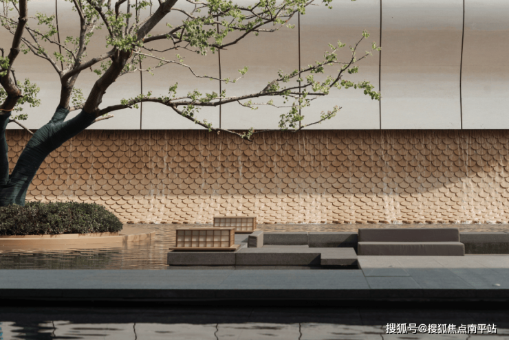 在这里,下沉式庭院以磅礴的 跌水景墙、云锦画卷 ,还原 金陵四十八景中的《东山秋月》 。热烈生长的全冠乌桕树下,融于镜面水景、包裹性极强的 卡座 ,引导大家停下来放松身心。