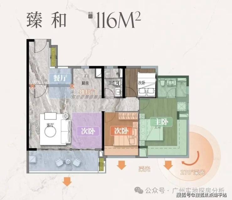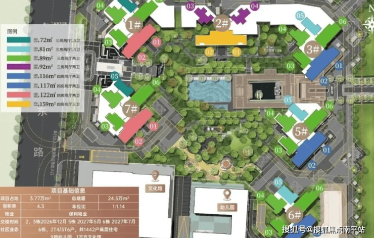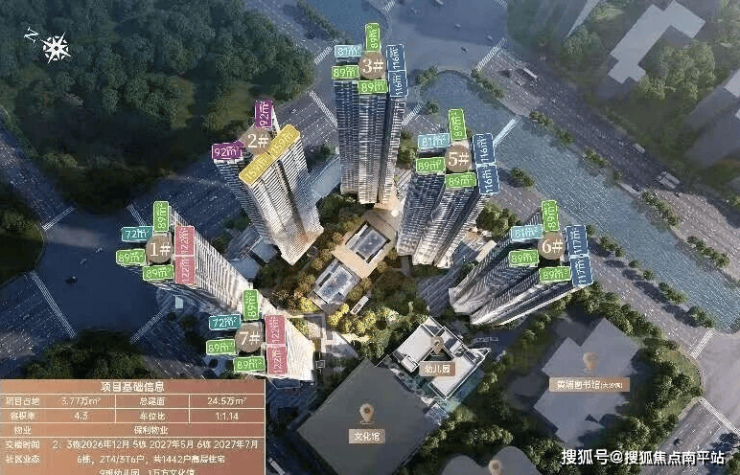 项目采用围合式设计,6栋47层高塔楼设计,小区自身配建有文化体育场馆和幼儿园,除了2#楼王是两梯四户,其余均为三梯六户,8#是5层高的文化馆,9#是配建3层高的幼儿园。