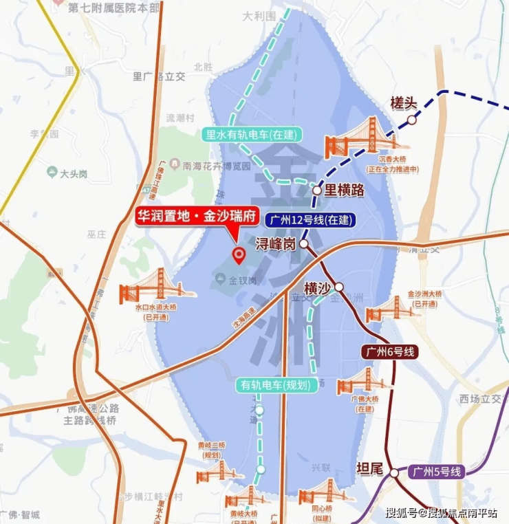项目距离地铁6/12号线浔峰岗站直线1.5公里。自驾有金金沙洲大桥、大坦沙大桥、沉香大桥在建、同心桥(在建)、水道口大桥、黄岐大桥、丰岗大桥、碧江大桥(规划中)全面环绕。