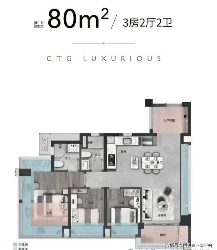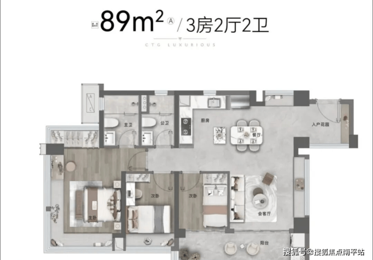 89方三房两厅两卫,百分百使用率,270度飘窗5.9米大阳台。
