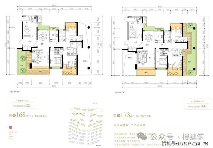 福州建发缦云 项目容积率1.82,产品定位148-168平米纯商盘。在户型设计上,奇偶错层设计,每个户型都搭配了 独立的庭院 , 约6.2米挑高 ,而且这部分面积是完全赠送。 建面约148㎡配置双阳台、建面约168㎡则配置了三阳台。