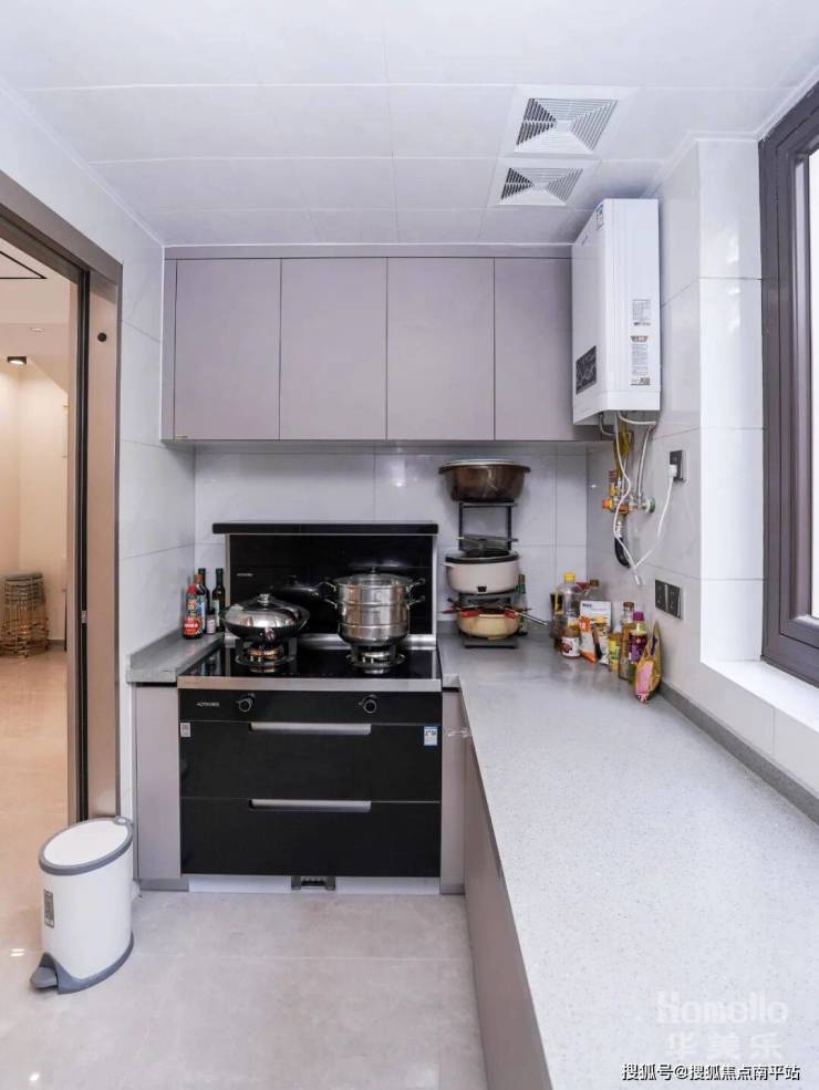厨房U型布局,这样空间更开阔,使用起来也更舒服,柜门选择了一体的同色系。门板无造型,肤感柜门做下挂,免拉手设计,一门到顶简约又耐看。做台下大单盆,水槽低于台面,积水直接用抹布扫进台面,方便且实用。