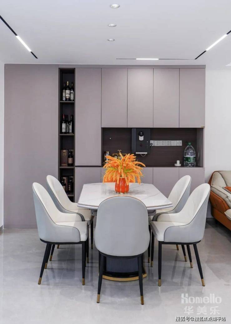 整个配色以浅色系为主,如客厅的浅灰色地面和留白墙面,营造出简洁、明亮、宽敞的视觉效果。米色和橙色的家具相呼应,增添了温馨感,能够为家庭空间带来一种独特的高级感与温馨氛围。