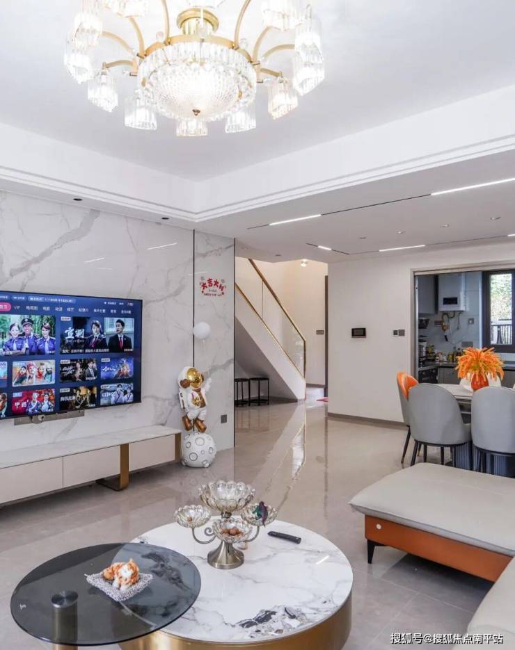 通刷大白墙、通铺大理石地板提高了室内明亮度, 双眼皮吊顶搭配水晶吊灯,简约的同时带出高级感。