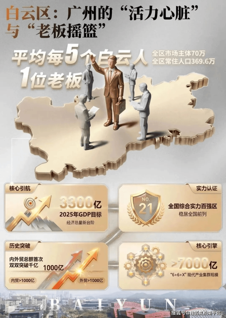 🔹2025年白云区GDP剑指3300亿,增速连续两年全市第二,首创“内外贸双千亿”,跻身全国百强区前列。白云新城作为白云经济的核心引擎,凭扎实的企业根基,包揽白云GDP半壁江山。