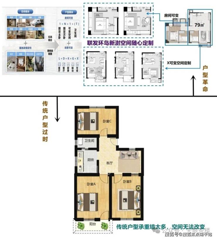 联发环岛新澍所有户型摒弃了传统框架剪力墙结构,通过「承重墙归边」,尽量减少不必要的承重墙,让年轻人根据自己的喜好,可以对户内各功能区自由打通设计。