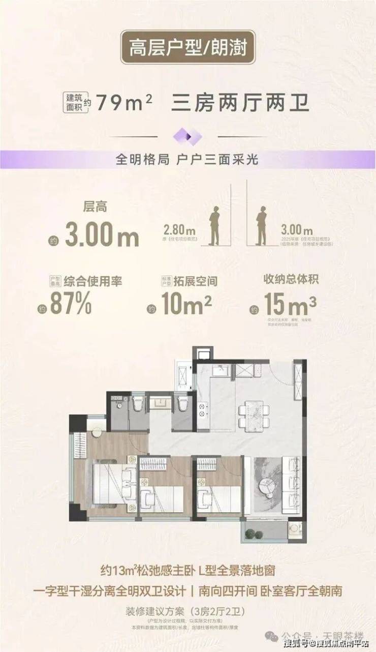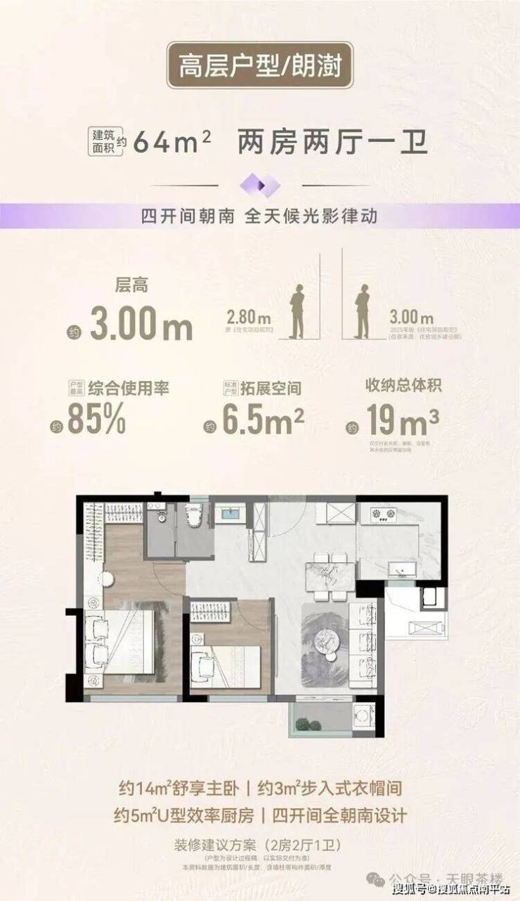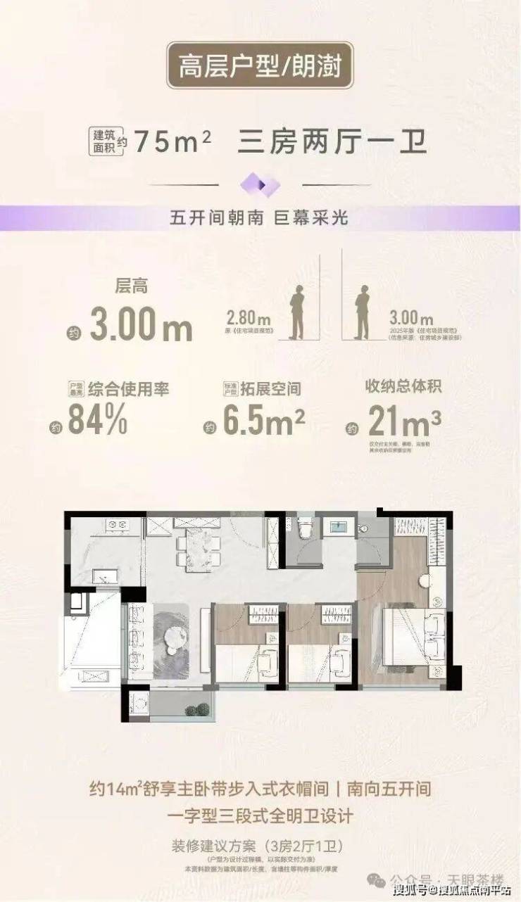 项目规划4栋瞰海高层(部分),64㎡2房、75㎡3房、79㎡3房、89㎡4房,层高3米;5栋低密洋房,95㎡和112㎡4房,层高3.1米,类独梯独户设计,户户都有一个12-13㎡的入户电梯厅。高层和洋房全系均有外阳台。
