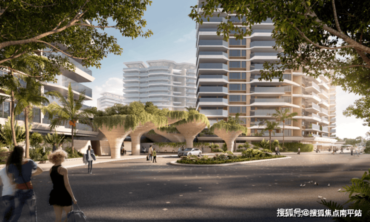 建筑立面整体呈现代简洁风格,结合海岸风情、海水湿地环绕的环境特质,以更加生动的形式去营造和谐与整体的比例,强调地域化的特征。设计提出松弛度假的主题,通过变化的水平线条表达横向舒展的意向,勾出动态、生动且有生命力的建筑形象。同时在近人尺度上增加建筑的丰富性。在建筑材料上,底部基座局部采用石材、仿木纹金属等材料,上部采用仿石铝板及金属装饰线条。营造一种属于三亚的,质朴的、放松的、自然的、现代的建筑气质。