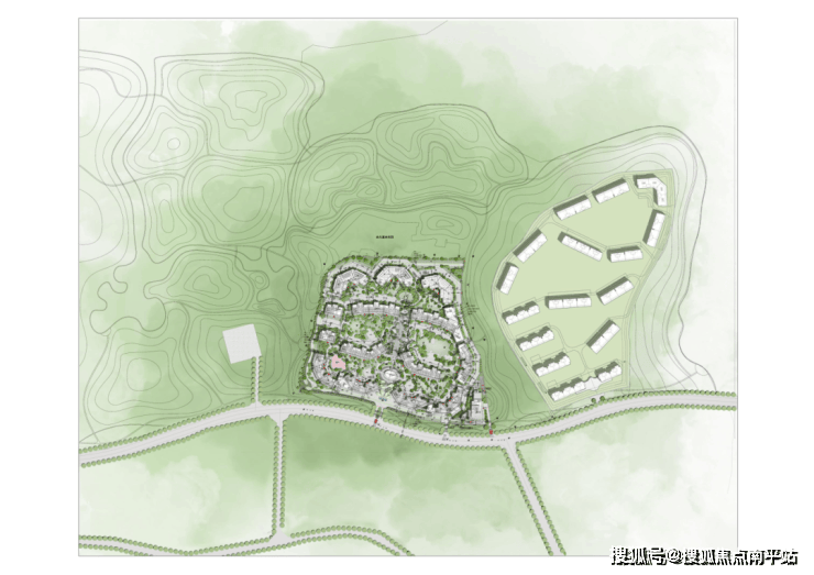 项目总图规划布局以板楼为主,建筑楼栋朝向顺应用地红线轮廓及景观朝向布置,整体呈现有机丰富的外围形象界面以及生动有趣的空间形态。本项目共有14栋高层住宅,其中10栋沿着红线外围贴临布置享有最好的外部景观,4栋位于场地内部,结合园区景观营造。中心庭院设置大尺度下沉空间,主题花园结合空间布局也设置次级下沉小院,把地上阳光、自然、空气引入到地下空间,形成通透、连续、生态的立体社区。