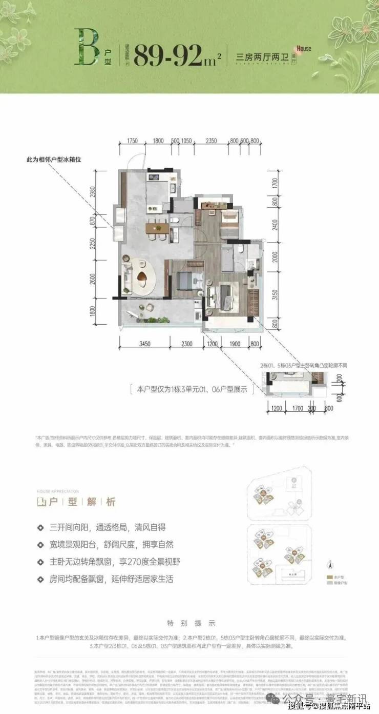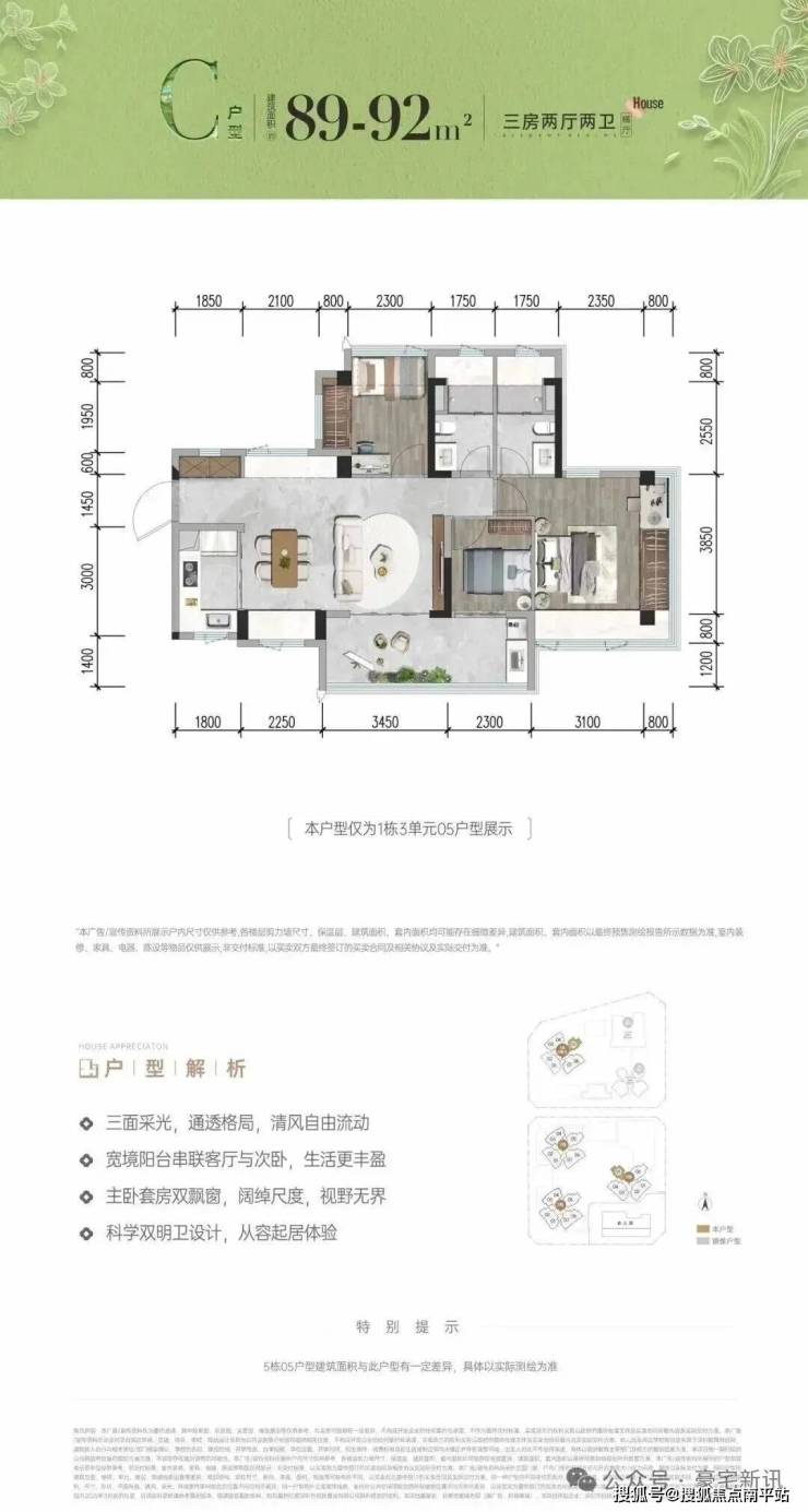 首次推首北地块1栋3单元,约80-92㎡ 3房,共195套,新规使用率高达96%-105%!