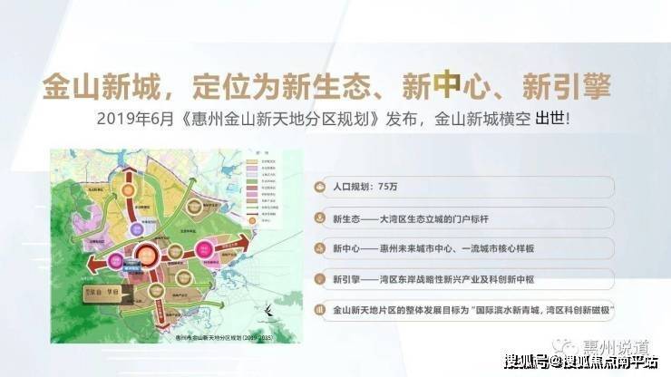 2021年惠州"两会"重点提出将以国际眼光、一流标准规划建设金山新城,重点推进科教片区、南站片区建设,启动新会展中心建设。新生态,新中心,新引擎,这是《金山新城规划公示文本》中对金山新城的明确定位。