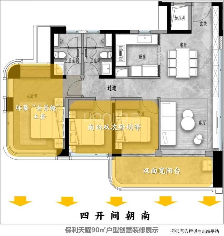 - 格局:端厅设计,约40㎡阔绰客厅,双套间主卧,270°观景面