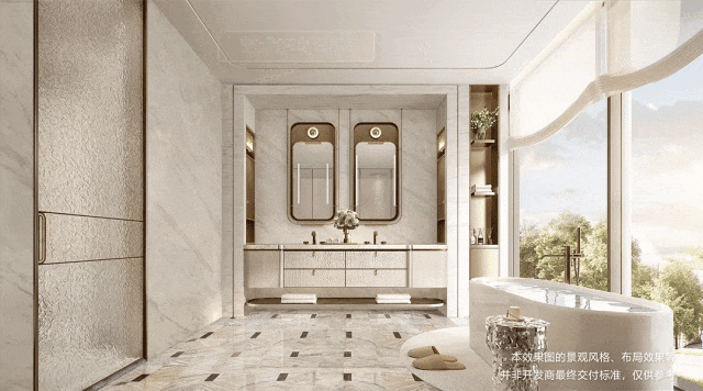 比如,约190㎡主卫墙面选择整面石材,地面铺就石材拼花,防潮抗污的同时,更有历久不衰的美感。