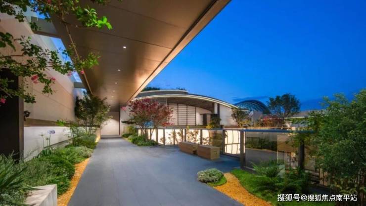 地面庭院四周被景墙包裹,西侧风雨连廊直通社区深处,东侧以高低错落的绿植点缀通道。