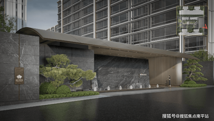 拱形门廊好似船篷,呼应运河文化;两侧造型松姿态苍劲,拉满归家仪式感。