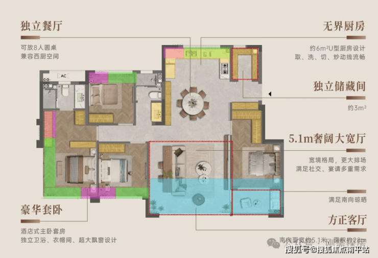 首先是入户下移,不再影响餐厅,餐厅也有了完全独立的空间,客餐厅做到完全的南北通透,次卧有了一个独立卫生间,虽然是暗卫。
