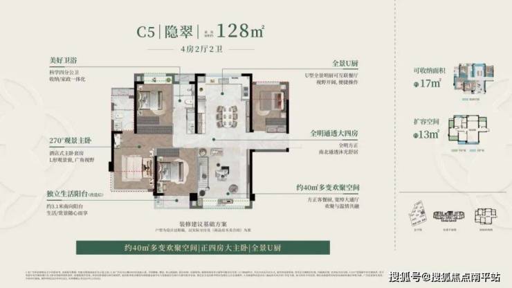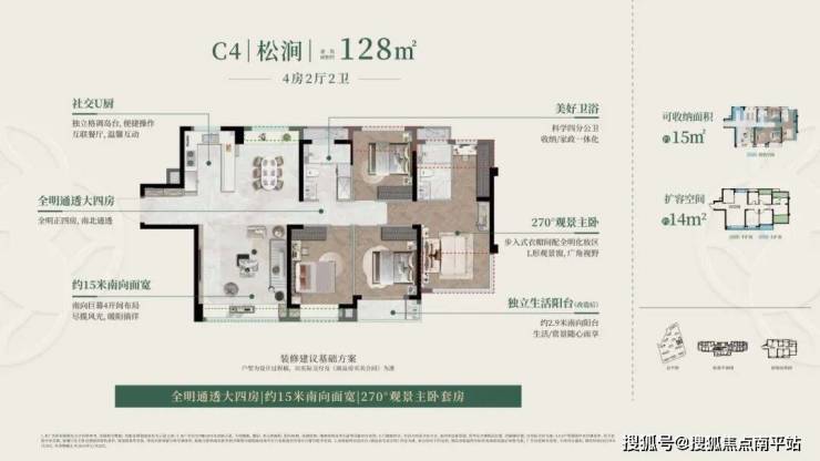全线户型采用三至五开间朝南设计,南向面宽约12.4-17.5米(含墙),大幅领先于市面上同类产品, 如建面约128㎡,超15米南向四开间,四面宽朝阳,实现了同面积段罕见的极致采光与通风效果,显著优化了居住舒适度。