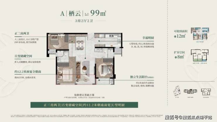 建面约99㎡三房户型则挑战了市场对百平以下户型空间局限的固有认知,将收纳效能发挥到极致: 整套房屋收纳容量最高可容纳超500个20寸登机箱,真正实现“小户型、大容量”。